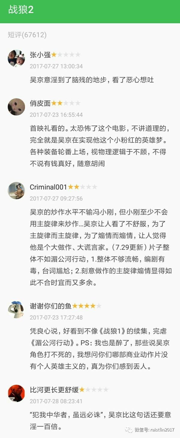 但无论什么电影都不可能讨到所有人欢心,特别是主旋律爆米花大片,势必会有讨厌的人,所以在《战狼2》刚刚爆火那会儿,豆瓣上有不少讨厌这部电影的短评。