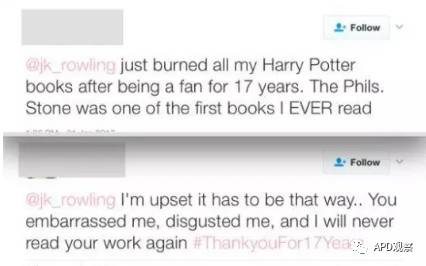 二号: 罗琳,我喜欢了你17年,《魔法石》是我读的第一本书,但是刚刚我把所有哈利波特的书都烧了! 要用这种方式来结束,我也很难过,你让我感到丢脸,让我恶心,我再也不会看你的书了!