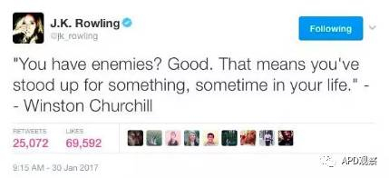 面对各种网友攻击, 罗琳又引用了一句丘吉尔的名言: “你有敌人?很好,这意味着你的一生中,你为了某种东西坚持过。”