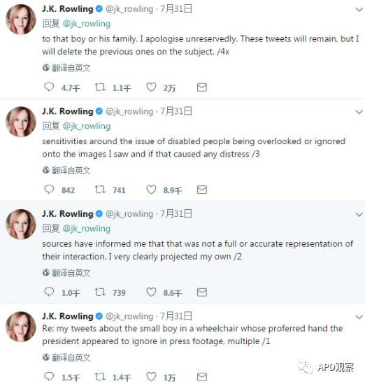罗琳31日在“推特”上道歉,“我的推特中,关于轮椅上的小孩想要跟特朗普握手却被忽视的新闻镜头多个消息源告诉我,那不是(特朗普与男童)两人互动情形的全面或准确呈现。很明显,我对于残疾人遭忽视或无视问题的敏感,影响了我对视频影像的理解,如果因此对那个男孩或其家人造成困扰,我在此诚心诚意道歉。”