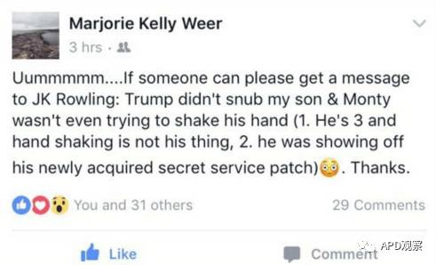 罗琳7月28日在“推特”上就此发表评论:“太惊人,太可怕了,特朗普竟然不肯屈尊和一个小男孩握握手,他只想触摸一下总统而已。”她随后又发布了6条相关“推文”。