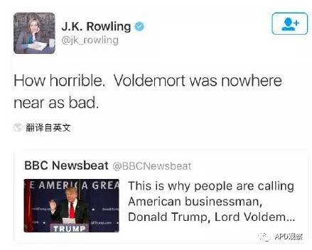 用罗琳的话来说,“特朗普,是个比伏地魔都坏的人。”
