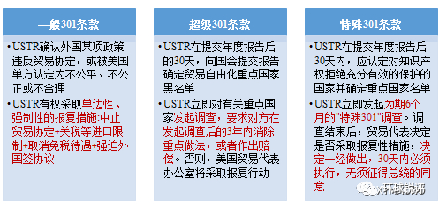 301条款是美国《1974年贸易法》中的一条。根据301条款,当美国贸易代表办公室确认某贸易伙伴的某项政策违反贸易协定,或被美国单方认定为不公平、不公正或不合理时,即可启动单边性、强制性的报复措施,报复手段包括中止贸易协定、关税等进口限制、取消免税待遇和强迫签订协议等。