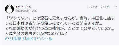 翻译:NHK特别节目“731部队的真相”。用战争的狂气这一句话来概括就再简单不过了。最恐怖的是那些肯定、散布这样的狂气的人,这就是“舆论”。如今在网络上嚷嚷、煽动着“杀死匪贼!”的人,就是那些不想要承认这个节目内容的那群人。