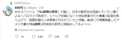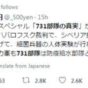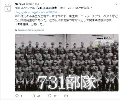 翻译:NHK特辑《731部队的真相》非常的过分。通过图谋对日本进行分割统治过的苏联、通过在伯力的裁判、通过那些被囚禁在西伯利亚经过洗脑教育的战俘的证词,就做了这一期特辑,说部队把细菌兵器在人体上进行实验。美国部队在战后也对731部队进行了大规模调查,结论是说731部队是防疫给水部队。