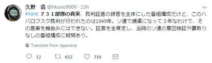 翻译:8月13日播出的NHK特别节目“731部队的真相”,从它要证明“真相”这一点看,虽然公开了伯力城裁判的录音,但是其中大部分是荒唐无稽的言论,毫无信任可言。这些是被拘留超过3年,受到拷问的人的证言。关于731部队人体实验和细菌战争的谎言,美国国立文书馆早在2007年就公开过文献说明了。