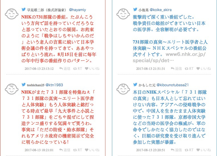 731部队的特集,就像嚼了没味儿的口香糖,说是有什么新事实,其实都是编的;就跟慰安妇事件一样,NHK还是解体吧,一定要重建国有化了;