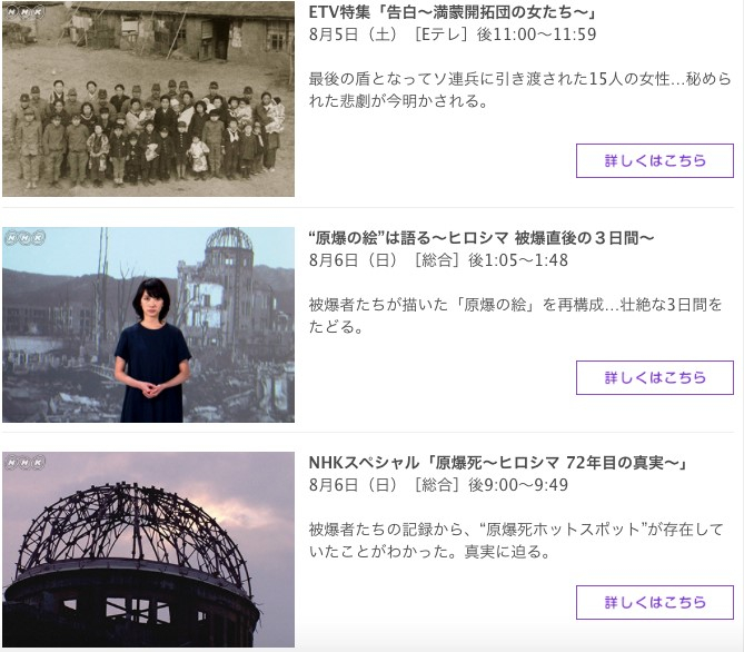 8月15日,是日本战败日。实际上,每年在这一时期,NHK都会制作很多相关的节目,主题基本一致,即“战争与和平”,主旨思想是战争带给人类的灾难是毁灭性的,应该远离战争。
