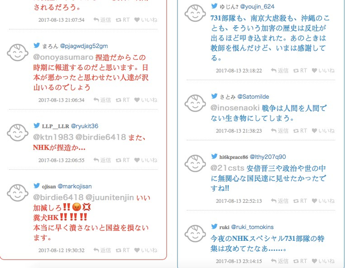 另一部分人则认为,这都是虚假的,伪造的。这种“自虐的价值观”是错误的。更有日本的“网络右翼”骂NHK是“卖国媒体”。