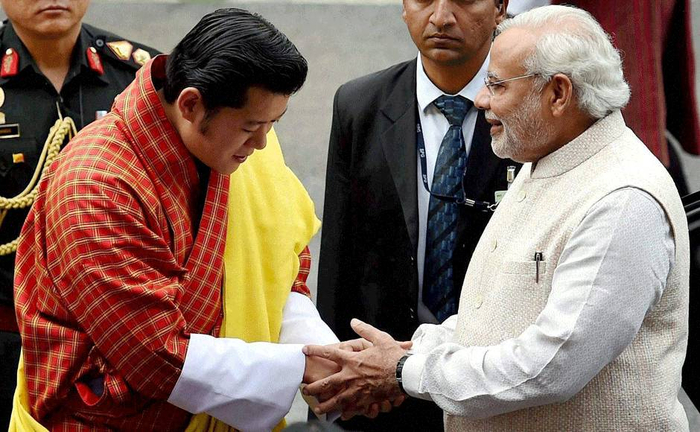 不丹国王与印度总理莫迪会面。印度可以说是与不丹的关系最密切的国家。不丹在对外事务上受印度指导,印度在不丹境内有驻军。不丹在与其他国家发展外交关系时需要顾及印度的态度。不丹是中国邻国中唯一没有与中国建交的国家。