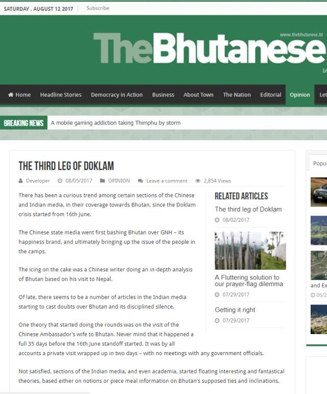不丹英文媒体《不丹人报》(The Bhutanese) 8月5日发表该报主编丹增蓝桑(Tenzing Lamsang)的文章《支撑洞朗的第三条腿》,文章呼吁中印媒体都应冷静,不丹的沉默是为顾全中印的“面子”,让各方有回旋空间。全文如下——
