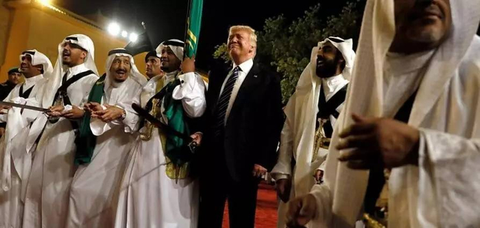 ▲美国总统特朗普就任后首次外访来到沙特阿拉伯首都利雅得,他在5月20日晚间参与了传统剑舞(Ardah)欢迎仪式。(BBC)