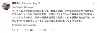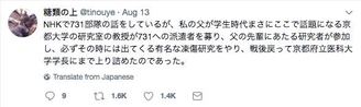 △说到NHK731部队,我父亲在学生时代里确实经历过这个话题。当时京都大学的研究室教授正招募派遣到731的研究人员,父亲的学长有合适的去了,肯定参加过有名的冻伤研究,战后还回到了京都府立医科大学成了校长。