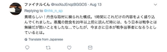 而公开播放这部‘违背主流’的纪录片,能证明NHK就是日本的良心吗?结合前几年NHK的高官针对慰安妇的不当言论与部分右翼倾向,实在不能就此下定论。虽然已经更换了新的会长,我们只能认为,这也许是化冰的开始。尽管NHK早已不是国营广播,而属于独立于政府的民营组织,能发出此种声音,也是一种勇气。