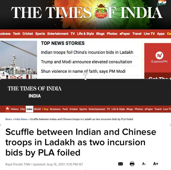 《印度时报》也在网页新闻头条报道了上述事件:“在拉达克地区中印军队发生摩擦,中方两次试图“入侵”被挫败