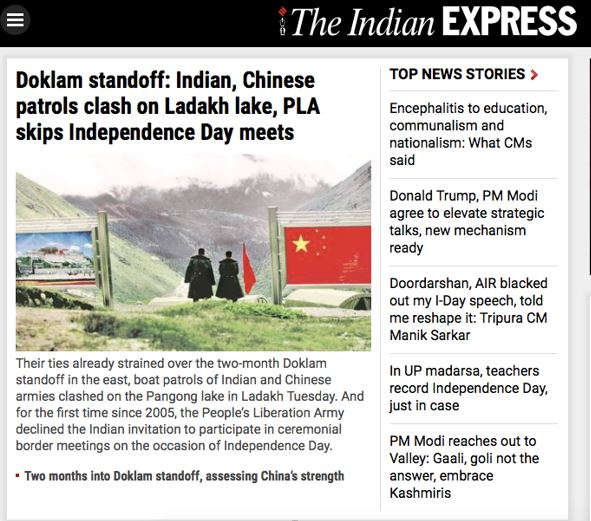 《印度快报》网页版头条即为本次“摩擦”事件,标题为“洞朗对峙:中印边防人员在拉达克湖冲突,中国军队拒绝出席印度独立日双边会晤”。