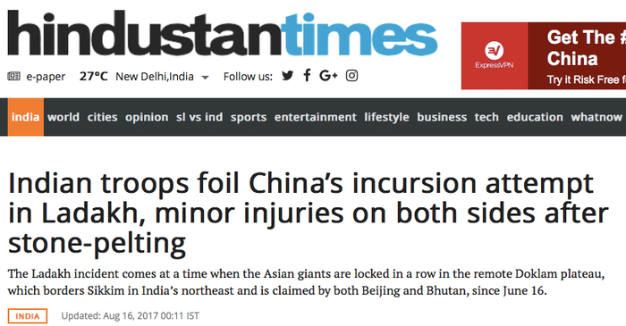《印度斯坦时报》称:在亚洲两大巨头被困于洞朗对峙的背景下,这次拉达克摩擦发生了。报道称,在印度庆祝独立日的时候,中方军队两次试图进入查谟-克什米尔邦的拉达克地区。在班公湖附近,中印军队正面发生摩擦。