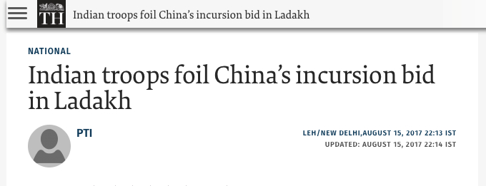 在印度庆祝独立日的第二天, 印度主流媒体的头条被中印边防人员的“摩擦”占领。《印度时报》、《印度快报》、《印度人报》等印度主流媒体均重点报道了“中印军队边境互扔石头”事件。这些印度媒体声称,中国士兵试图在“拉达克”“入侵”印度被挫败,而之后,中方士兵向印度边防人员扔石头,而后者则“敏捷”地捡石头回击……