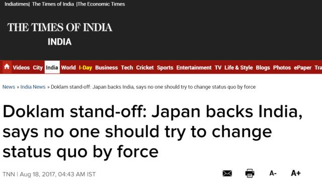 据《印度快报》等多家印度媒体18日报道,洞朗对峙两月后,印度终于获得一个大国支持:日本。