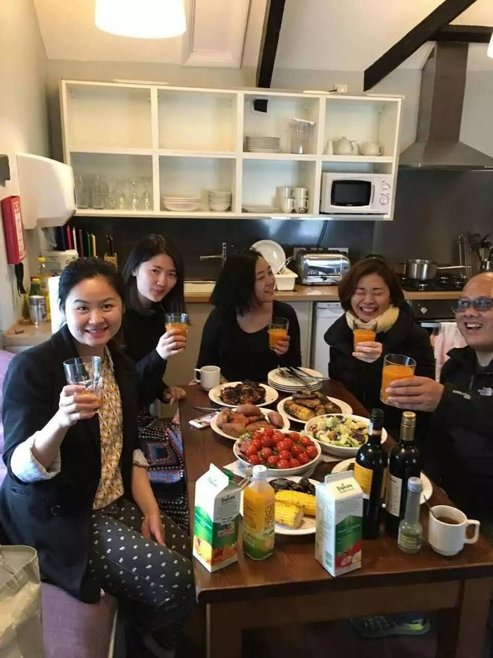 一群中国游客在位于英国康沃尔海滨的民宿里享用晚餐