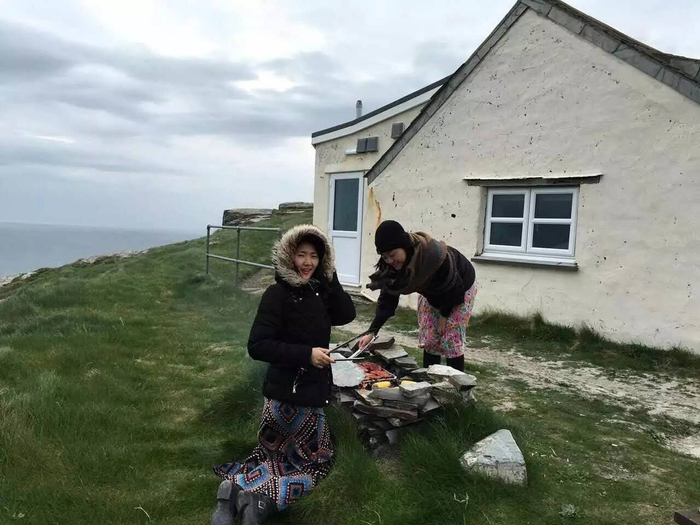 两名中国游客在位于英国康沃尔海滨悬崖上的一家民宿院子里烧烤。