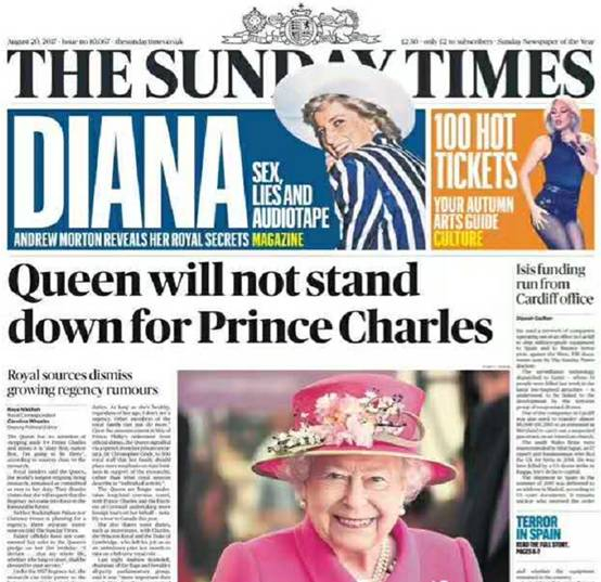 但昨天,英国主流大报《泰晤士报》援引王室消息人士的话在头版头条对此表示,英国女王不会退位给查尔斯。