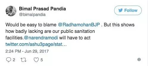 今年6月,印度农业部长拉达·莫汉·辛格在户外随地方便的照片在社交网络上疯传,引起民众不满。