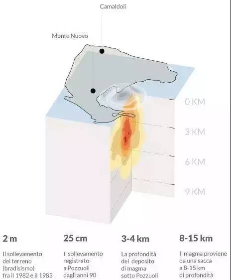 意大利《共和国报》报道,据地震部门监测显示,坎皮佛莱格瑞火山地下岩浆从2000年便开始逐年上涨,目前火山地表下不断喷涌的岩浆已累积成一个直径长达3至4公里、深3公里的巨大岩浆湖。这个不断膨胀的岩浆湖已使得附近波佐利(Pozzoli)地区的地表上升了25厘米。