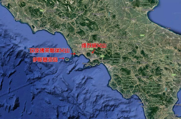 伊斯基亚岛、维苏威、坎皮佛莱格瑞,三者在那不勒斯湾形成了一个火山群。