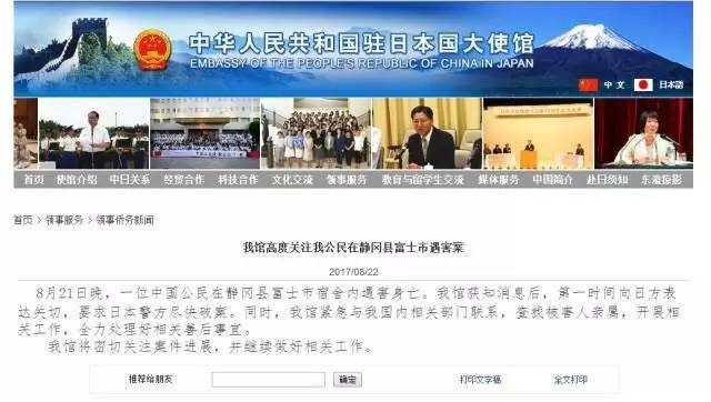 8月21日晚,一位中国公民在静冈县富士市宿舍内遇害身亡。我馆获知消息后,第一时间向日方表达关切,要求日本警方尽快破案。同时,我馆紧急与我国内相关部门联系,查找被害人亲属,开展相关工作,全力处理好相关善后事宜。