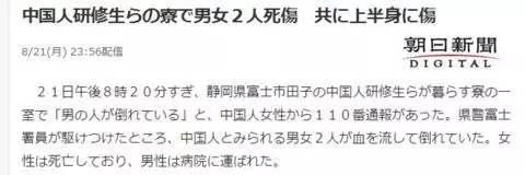 综合日本媒体报道,21日晚8点左右,在静冈县富士市的中国研修生宿舍内,一男一女倒在血泊中。警察赶到时,女性已经死亡,男性受伤严重陷入昏迷被送医。