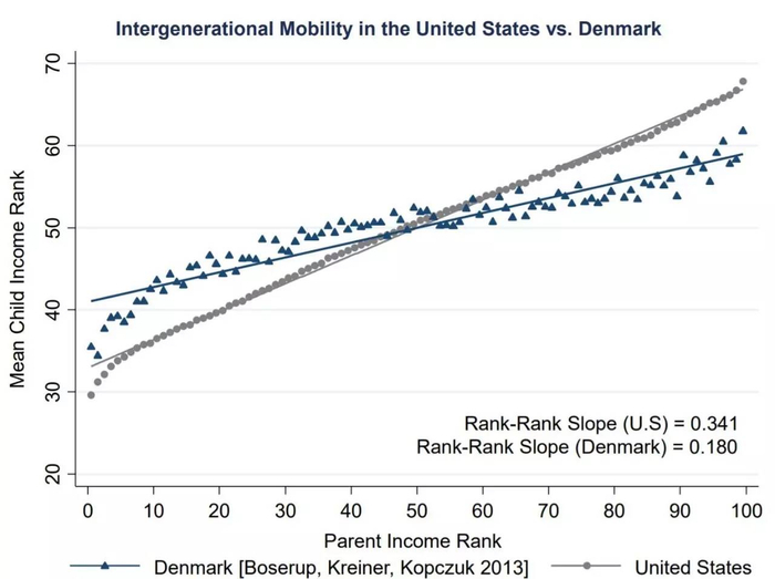 下图显示了美国和丹麦代际流动水平的差异。图中横轴是父母收入在全国收入分布中的排位,纵轴是对应的子女收入排位。代际流动性越高,父母处于哪个收入阶层对子女收入影响越小,因此散点对应的回归线越水平。可以看出,相比流动性较强的丹麦(蓝色),美国的父母收入分布与子女收入分布呈现更强的相关关系(灰色),在图中表现为更倾斜的线。