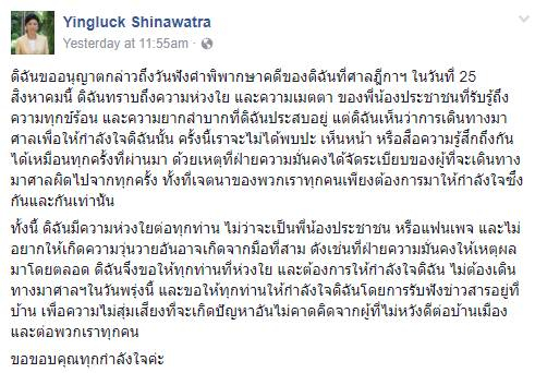 8月24日,也就是原定最终判决的前一天,英拉曾在脸书上发帖称,由于现场布满武装力量,她很担心支持者们的安危,她不愿看到骚乱发生,希望大家在家等候新闻。