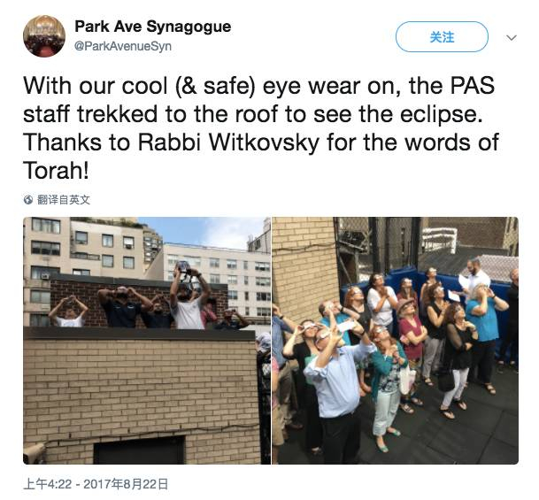 △ 纽约某犹太教堂组织成员看日食,并研习犹太五经