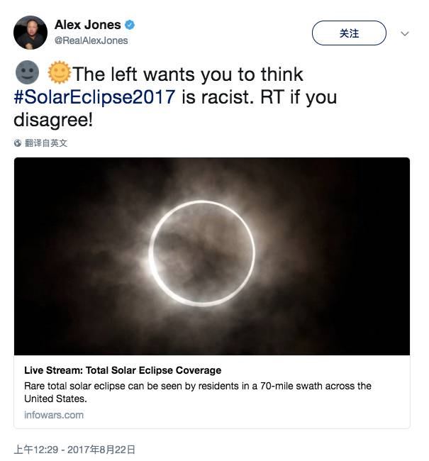 △ 琼斯怒怼左派媒体,指责他们称日全食是“种族主义者”这种说法太扯了