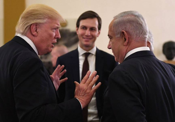 美国总统特朗普,以色列总理内塔尼亚胡,总统高级顾问贾里德·库什纳,图片来源:《耶路撒冷邮报》英文网