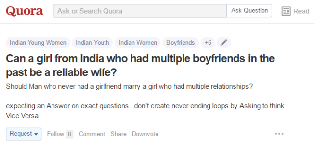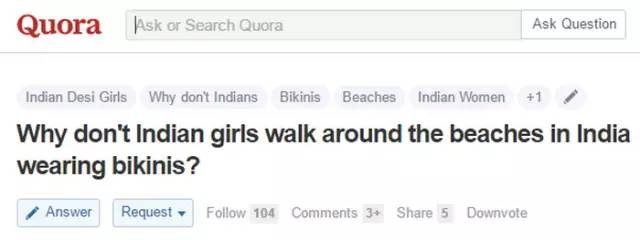 首先上面印度人提出的问题大部分确实和学校(印度理工学院是常见话题)以及专业学习有关,但是,我们在Quora上发现印度男性们提出了很多关于女性的问题,从常识性的不了解到技术型提问如何追女生统统都有,让人疑惑这些人干嘛不去交友网站……
