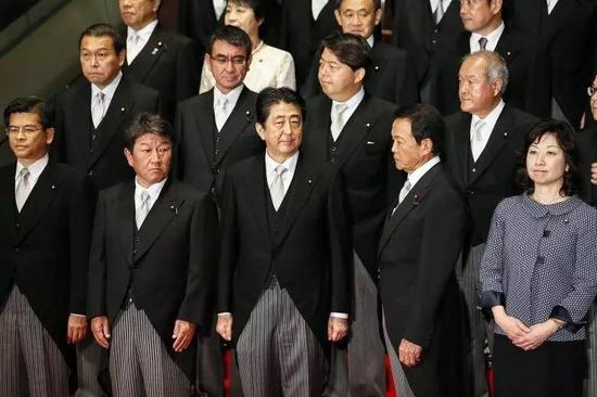 ▲8月3日,在日本东京首相官邸,安倍政府第三次内阁改组后所有成员集体亮相。(欧洲新闻图片社)