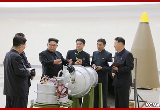 金正恩察看洲际弹道火箭战斗部将携带的新制造氢弹。