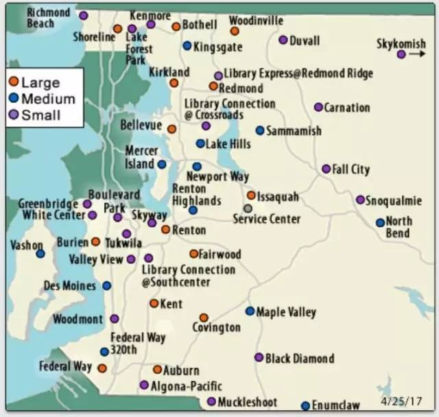 城市面积为142.5平方公里的西雅图,还没有北京海淀区那么大,却有星罗棋布的公共图书馆系统。橙色为大型图书馆,蓝色为中等规模图书馆,紫色为小型图书馆。