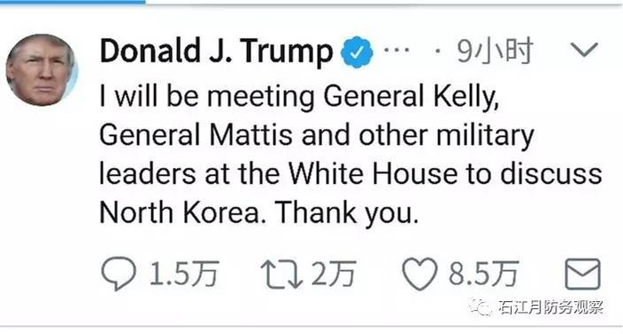 其实,这条推特没说的一层含义是:特朗普正在与军方高层商量几个核心议题,包括到底对平壤是否启动军事打击?如果启动,将采取何种方式?代价到底有多大?