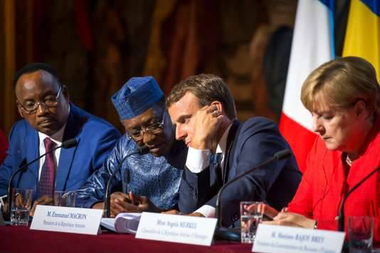 8月28号出席新闻发布会的部分国家元首,从左到右为:尼日尔总统、乍得总统、法国总统和德国总理