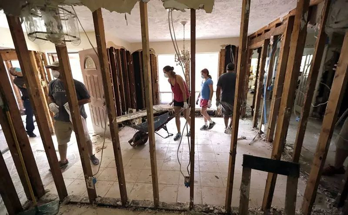 9月3日,在美国得克萨斯州斯普林,志愿者清理遭水淹的房屋。新华社/美联