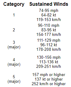 (飓风分级表。5级飓风的风速为每小时252千米或更高,几乎等于一架波音757飞机起飞的时速。)
