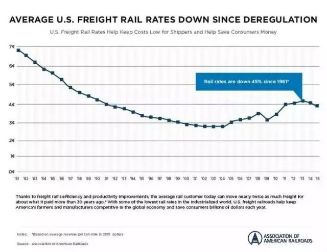 而且,美国铁路的货运价格在近40年内一直呈下降的趋势。把通货膨胀的影响计算在内,2015年美国的铁路货运运费比1981年下降了45%。也就是说,在美国,你在2015年花同样的钱,可以比1981年多运送几乎一倍的货物。这样一来,美国的铁路货运系统每年能为消费者节省数十亿美元。