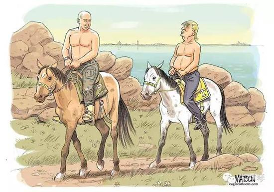 当然,在西方漫画中,特朗普偶尔也会脱光上身,但这种一前一后的角色,到底哪个是新娘,哪个是新郎呢?
