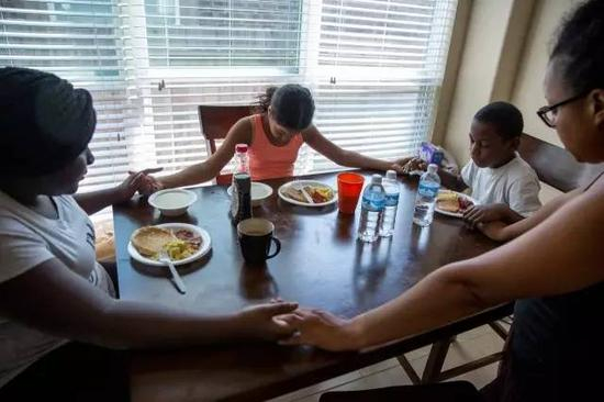一家人早餐前祈祷情况能尽快好起来(图片来源:纽约时报)