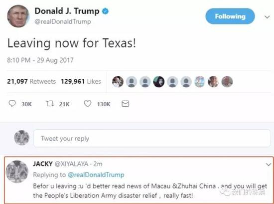 就在川普前往德州视察前,有网友专门在推特上给特朗普留言:让他先看看中国澳门、珠海抗灾的新闻,人民解放军救灾真的很快。