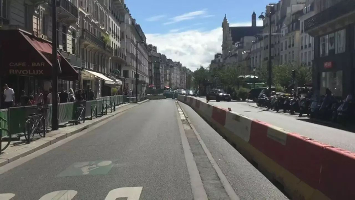 10月中旬起,Rivoli街Saint-Paul到市政厅这个路段将只有一个车道供汽车行驶。逐步地,到2018年4月,整个这条横贯首都市中心的、车水马龙的交通枢纽(从巴士底广场到协和广场)将只留下一条汽车车道。由此解放出来的另外一半空间将修建4米宽的自行车双向道,成为行人和公共汽车的天下。