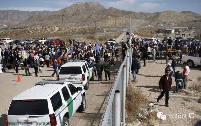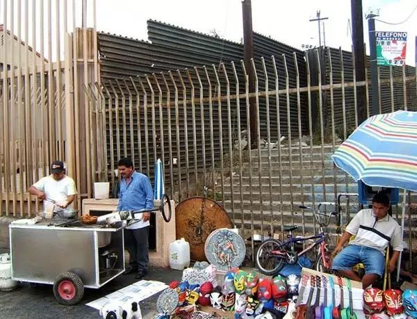 美国佬用SUV载着啤酒和帐篷慕名而来,墨西哥商贩则提前准备好了遮阳伞去“赛场”卖点小玩意,他们把摊子撑起来,摆上新鲜的卷饼,靠在栅栏上,大半个遮阳伞进入了美国的领空。